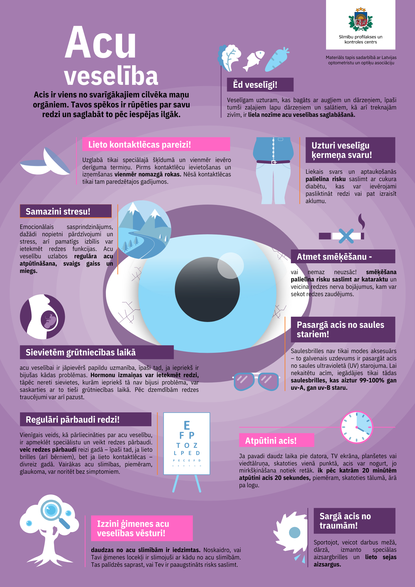Lai veicinātu acu veselību, redzes saglabāšanu, redzes pasliktināšanās novēršanu, kā arī vairotu iecietību un sapratni pret cilvēkiem, kuri saskārušies ar redzes traucējumiem, katru gadu oktobra otrajā ceturtdienā tiek atzīmēta Pasaules redzes diena. Šogad Pasaules redzes diena tiks atzīmēta 13. oktobrī, un tās ietvaros Slimību profilakses un kontroles centrs ir sagatavojis informatīvos materiālus par redzi. Aicinām izmantot tos!