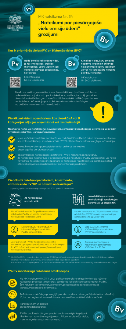 Vides aizsardzības un reģionālās attīstības ministrija ir sagatavojusi infografikas, lai informētu iedzīvotājus un uzņēmējus par 2002. gada 22. janvāra Ministru kabineta noteikumu Nr. 34 “Noteikumi par piesārņojošo vielu emisiju ūdenī” grozījumiem.